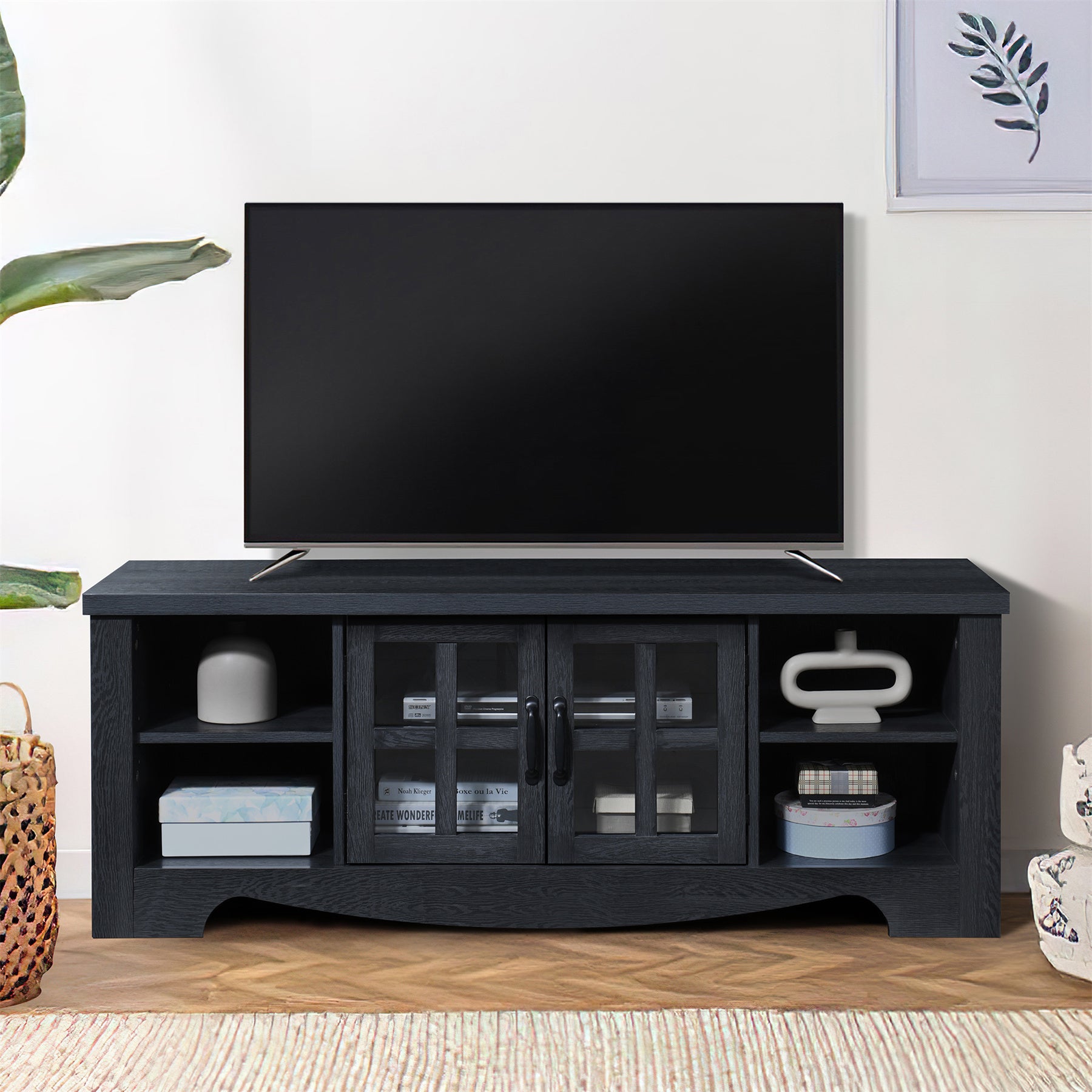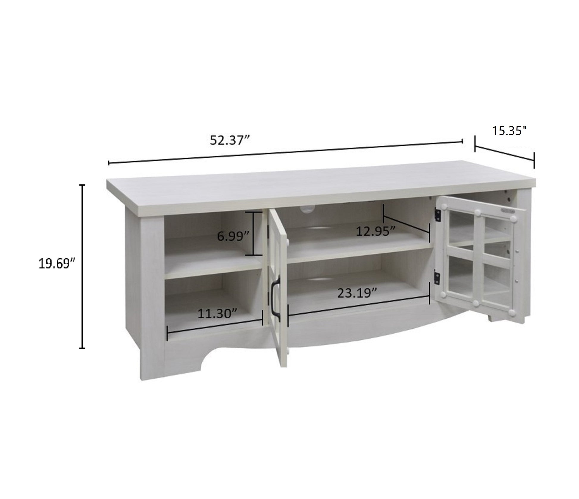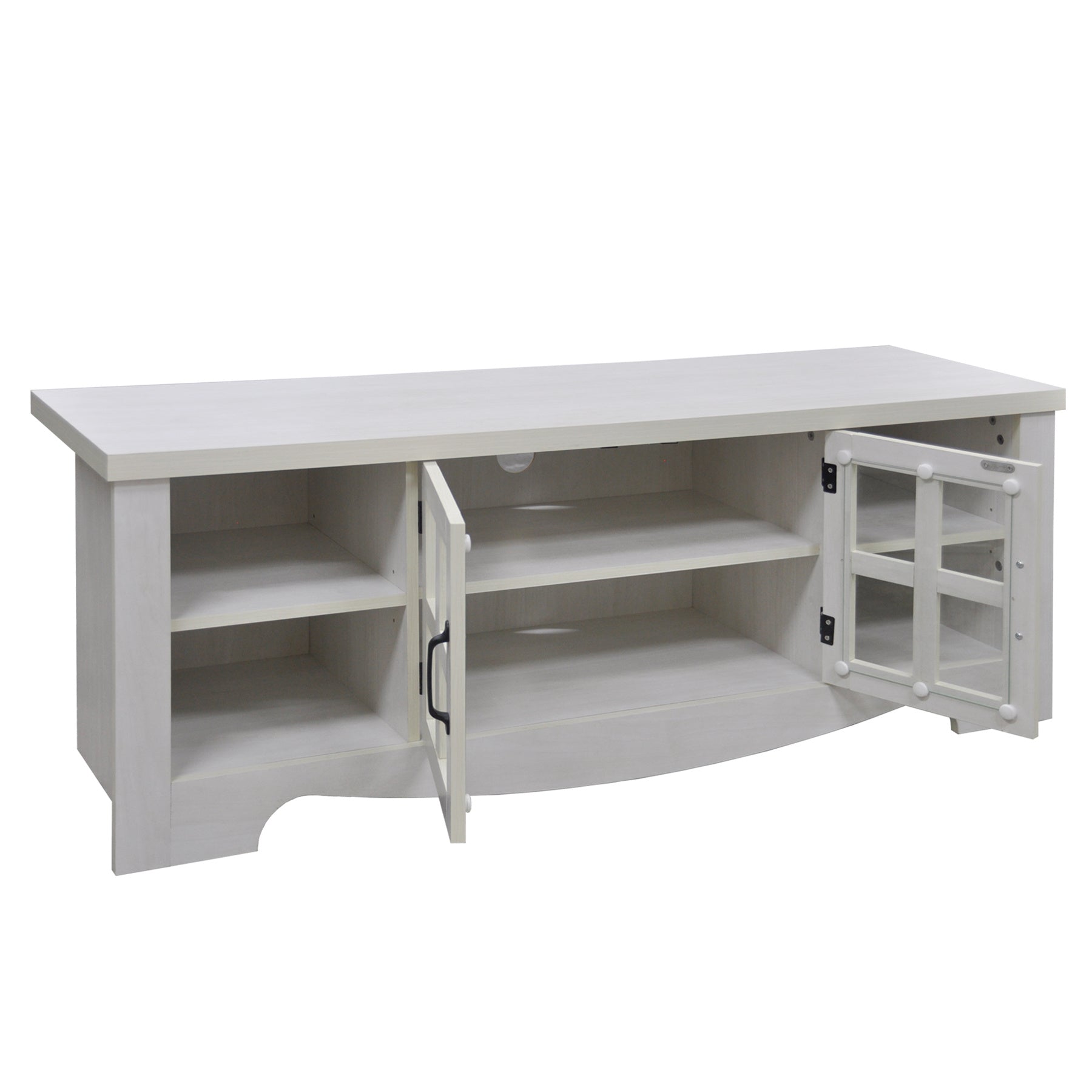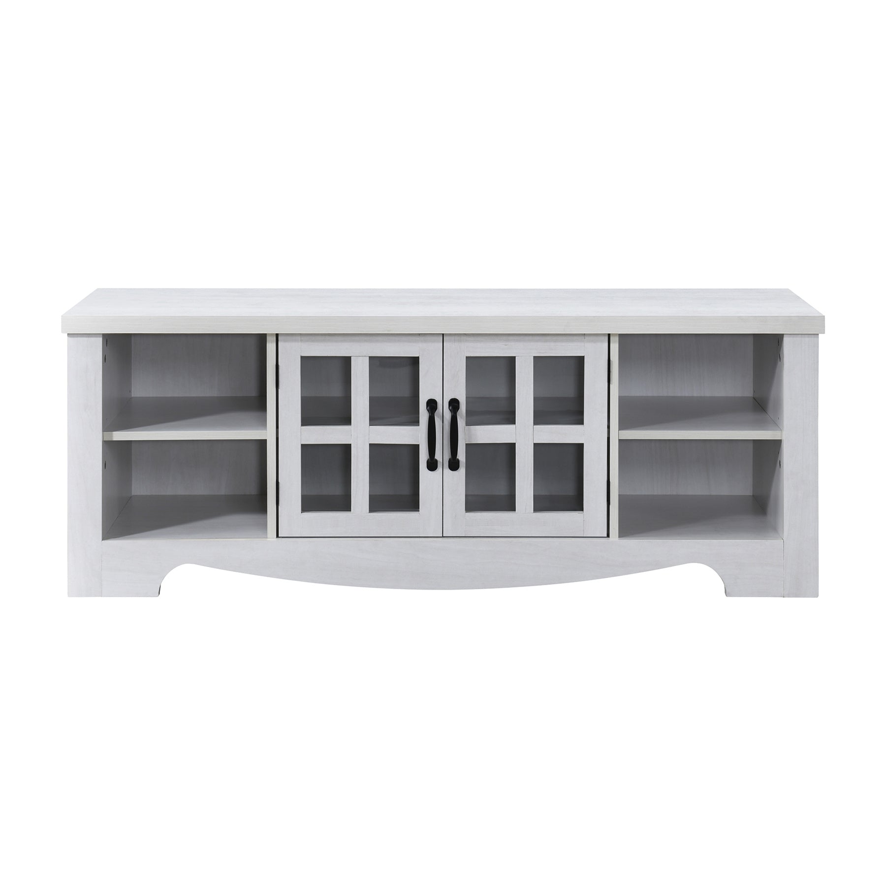 This elegant TV stand measures 52.37 inches in length and provides both style and functionality to your living space. It features two panel cabinet doors that offer enclosed storage, along with open side shelves perfect for media equipment, decor, or storage baskets. The sturdy design ensures durability, while the open shelves make it easy to organize your entertainment system. This versatile piece fits seamlessly into living rooms or media rooms, offering both practical storage and a refined look.